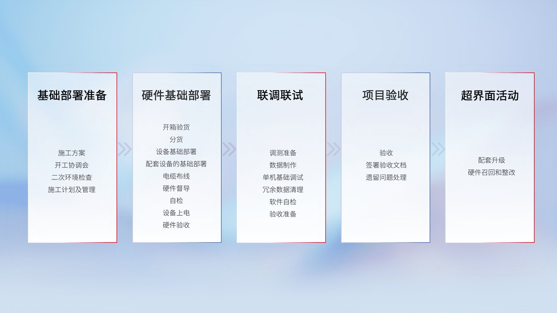 从基础部署准备、、、硬件基础部署、、联调联试、、项目验收、、、、越界面活动的全过程可追溯,,保证施工质量和进度。。
